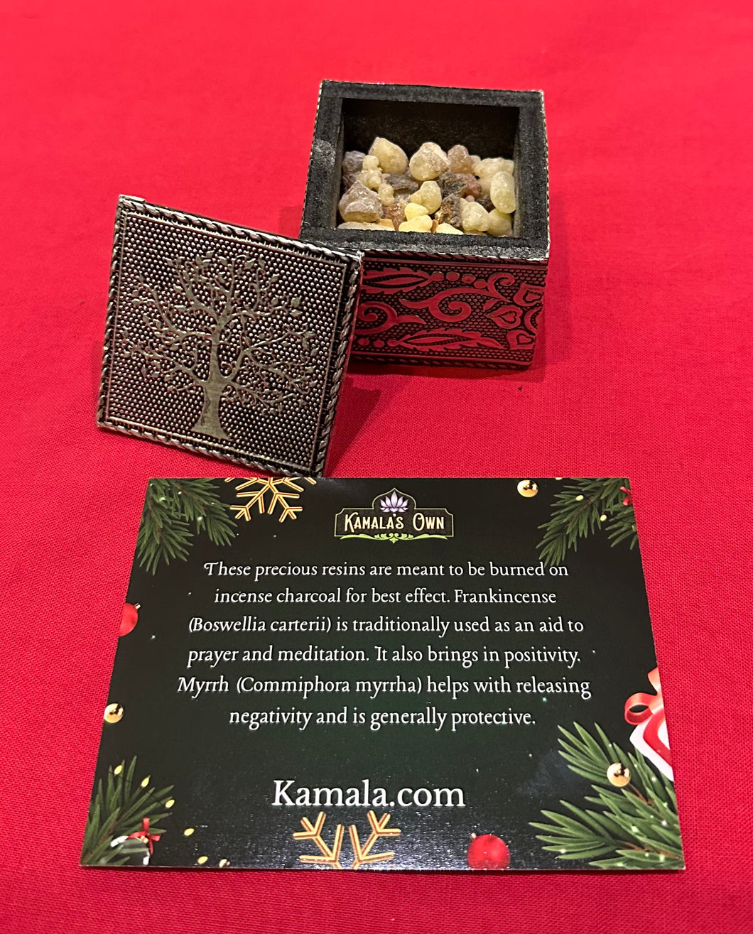 This decorative box contains a small amount of pure frankincense resin and pure myrrh resin. It comes with an informative card. It is a perfect holiday gift, especially when paired with some incense charcoal and a grate burner.